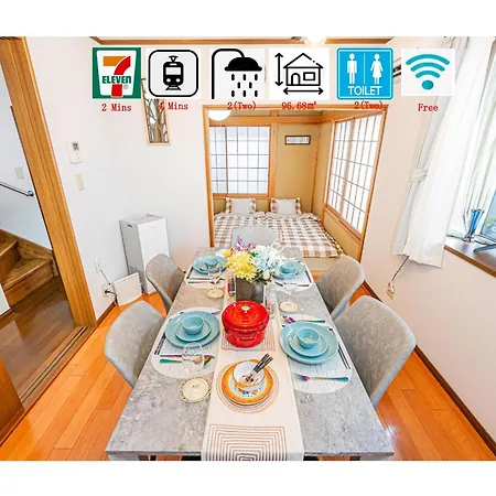 Asakusa-Ginza-Skytree-Stn-4Min-95Sqm-Garage-2Wc-2Swr villa is fitted with an equipped kitchen that comes with a refrigerator, a stovetop, and kitchenware. Guests can enjoy a meal at the café Cafe Plataku, located close to the property. Tokyo International airport can be reached in 37 minutes by car.